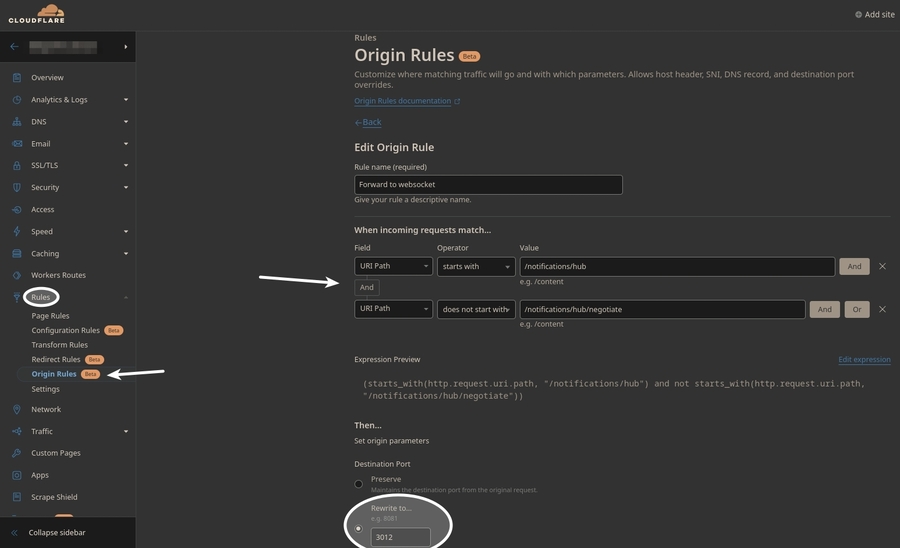 按照下面的截图创建新的规则。用于查找此设置的示例仪表板 URL:https://dash.cloudflare.com/xxxxxx/example.org/rules/origin-rules/new